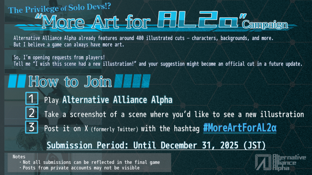 While playing the game, if there’s a spot where you’d like a new illustration, take a screenshot and post it to X (formerly Twitter) with the hashtag #MoreArtForAL2α