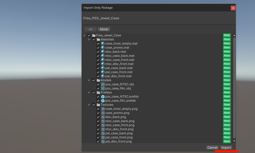 ファイル選択から解凍したアセットのUnity Package>Free_PSX_Jewel_Case.unitypackageを選択