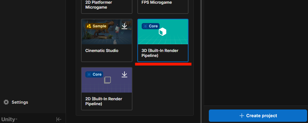 Templatesの中から3D(Build-in Render Pipeline)を選択しDownload templateを選択