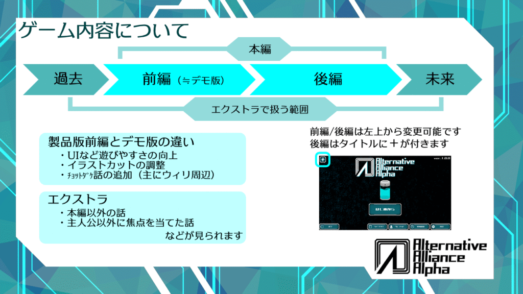 ゲーム内容の時間軸は以下の画像のようになっています。 既にデモ版を遊ばれている方は後編からプレイしても問題ありません。配信される場合はガイドラインに一度目を通すようご協力お願いいたします